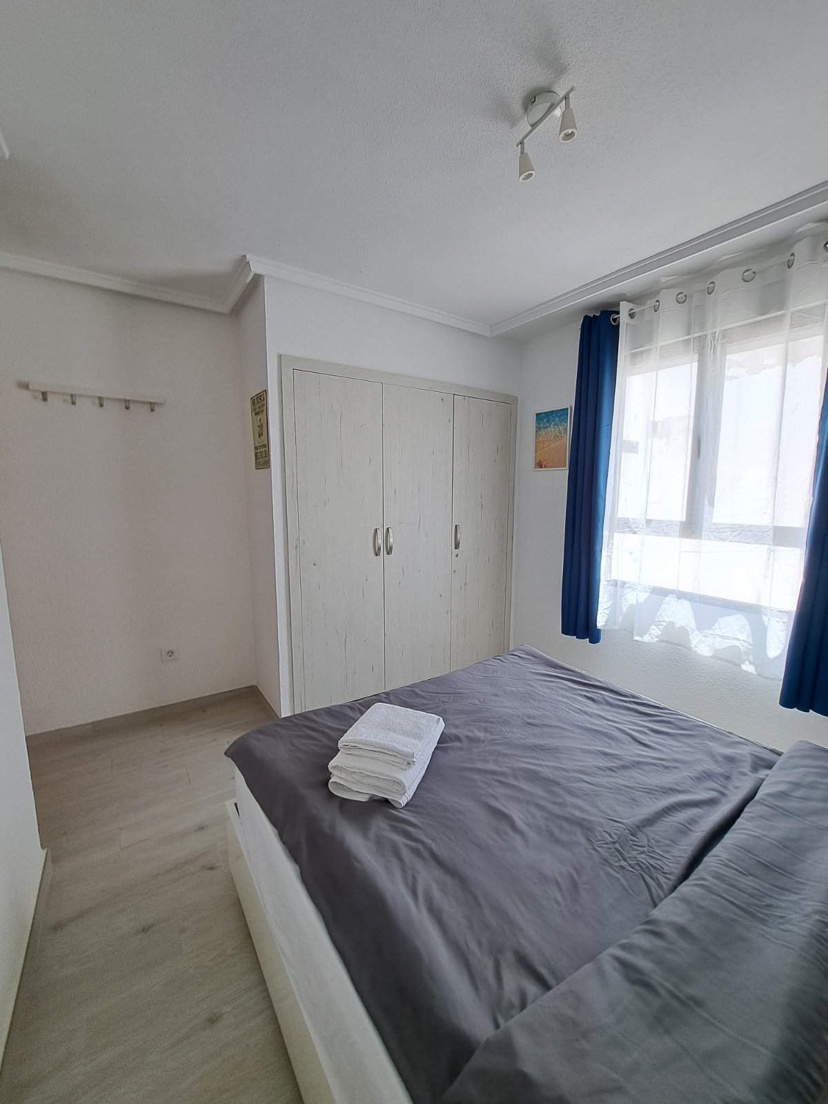 Kétszemélyes ágy, íróasztal, beépített szekrény, redőny